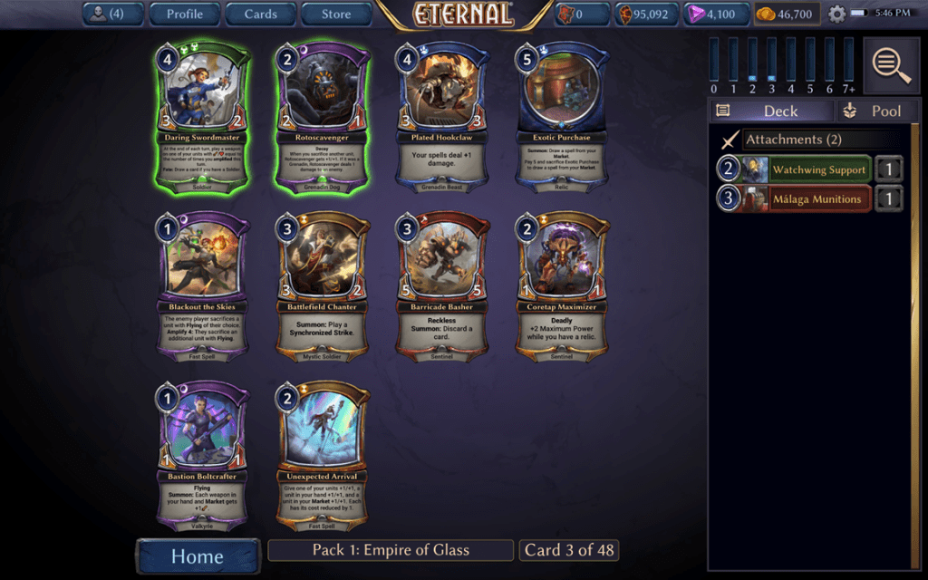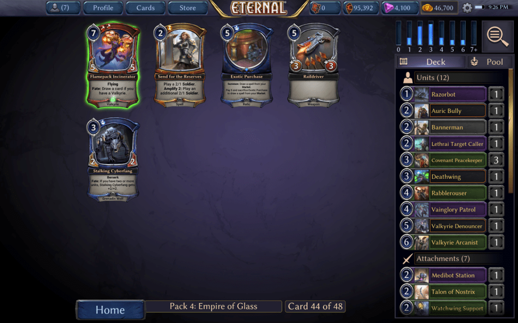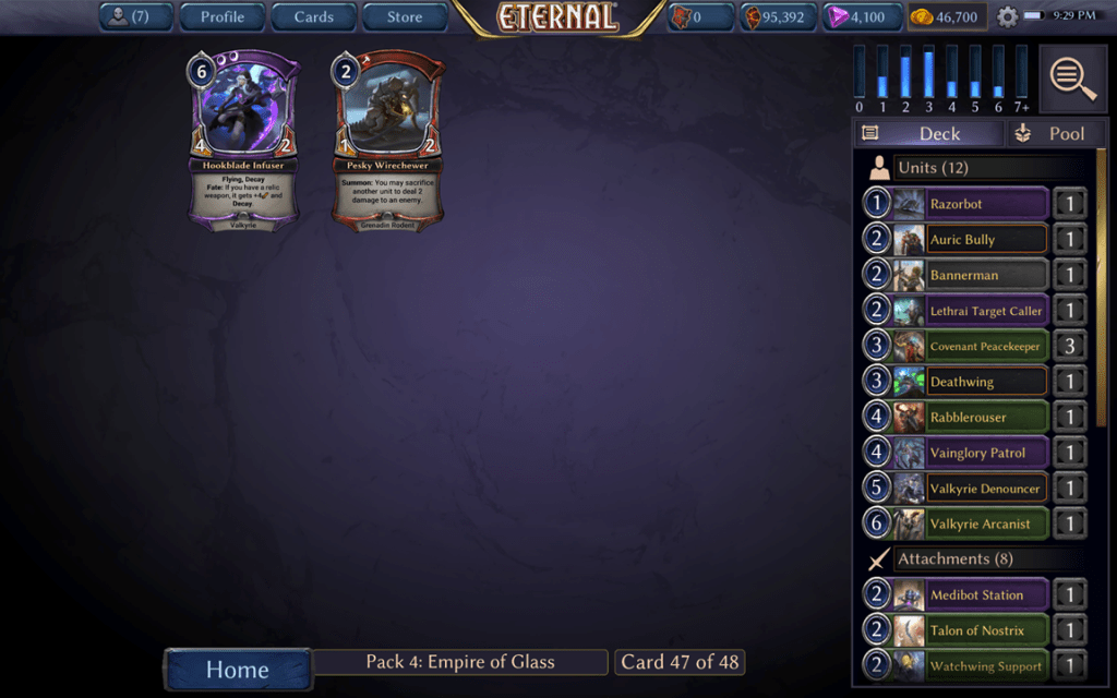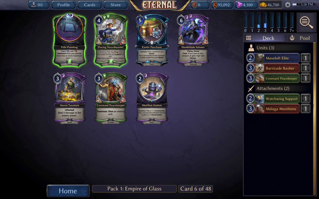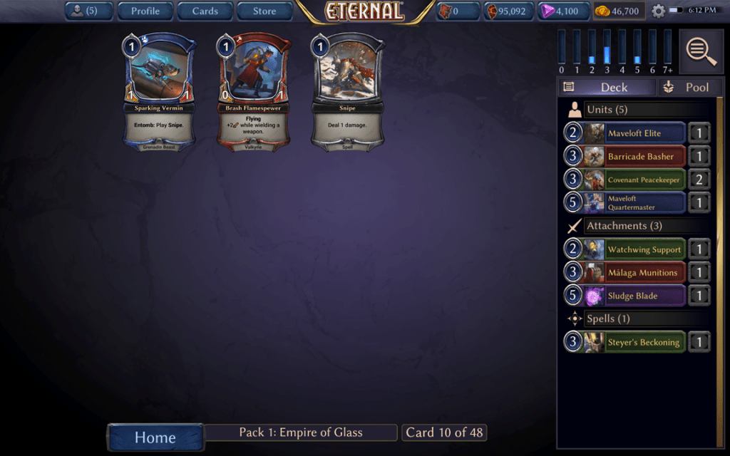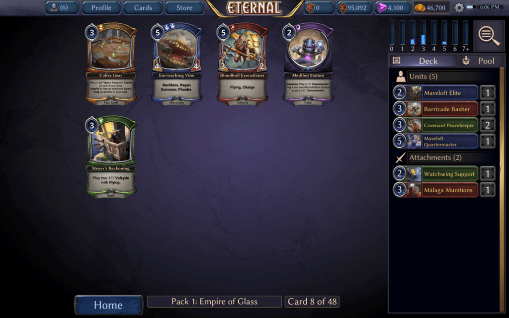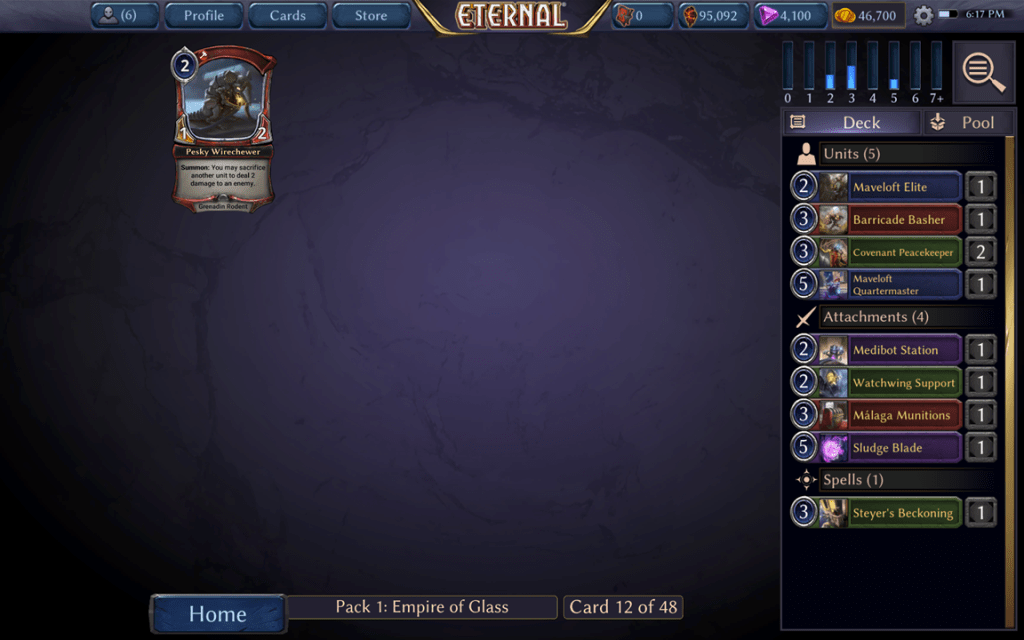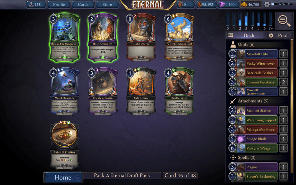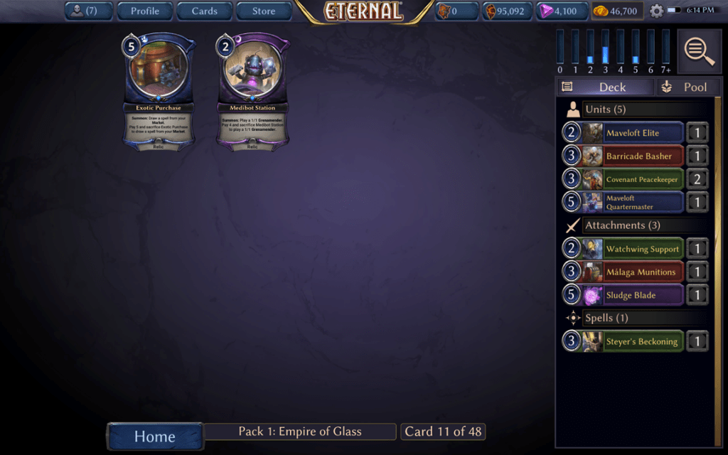 …well then. A host of solid cards in this pack, and frankly nothing I’d be too dissatisfied with playing. I don’t think I need a 2nd Steyer’s Beckoning since I just took one – the rate isn’t that fantastic. I could certainly hedge in the direction of Argenport, which would probably be best for my Watchwing Support, and frankly, having seen 3 Medibot Stations, perhaps that’s what I should have been doing all along. Emulator, on the other hand, is a factionless card, which means it slots in any deck, though as I mentioned previously, I’m not strapped for playables. I opt to take the Sludge Blade here since I do think it’s less replaceable of an effect than Emulator, though perhaps down the line when I don’t have any 2 drops I might be kicking myself.