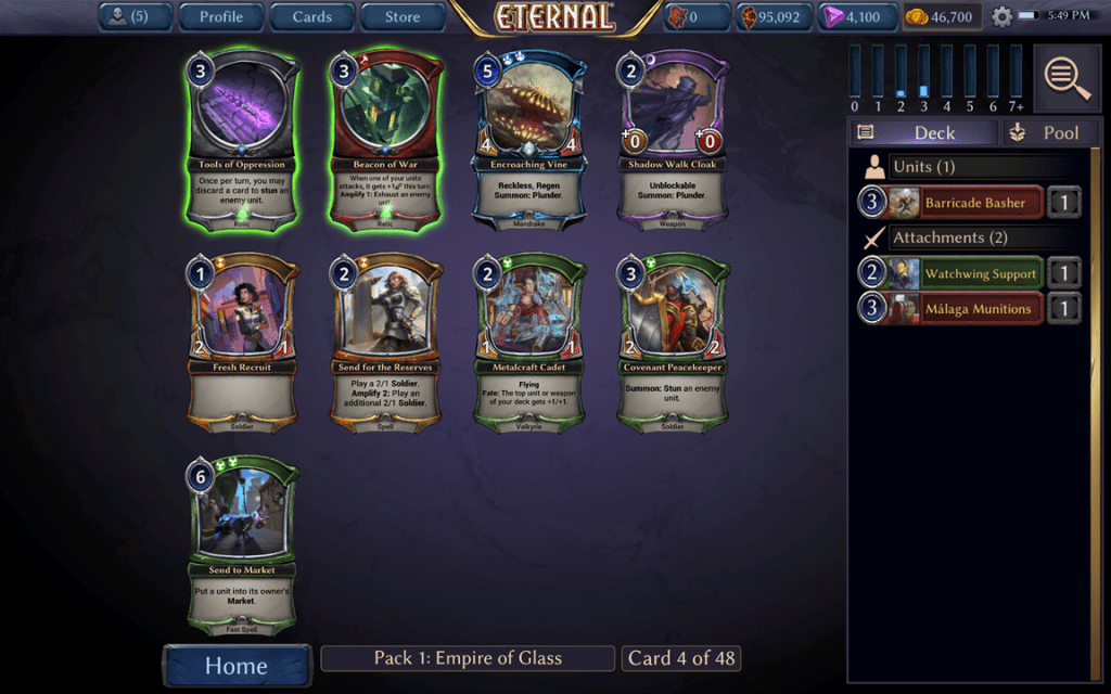 And immediately things get very interesting. We have Malaga Munitions, which works absolutely fantastically with our Watchwing Support by providing us 3 attachments – it’s not something I’d usually pick this highly, though I could certainly be swayed by the synergy. Coveted Gemstone and Beacon of War are both powerful attachments as well, though I feel they’re a little more conditional and narrow. My other consideration out of this pack is the Darkwater Vines – it’s a 1-cost unit I’d most certainly play, and the Regen helps to stifle a lot of aggressive draws. The only other Justice Card, Steyer’s Beckoning, is a solid card that I’d be fine with running, but I feel is a cut below the rest of my options, and one that I’m not looking to take so highly. Though I wouldn’t often take it this highly, I’ve been pretty impressed by Munitions in this format and it just works so well with Support that I feel compelled to take it here. Down for being wrong, however.