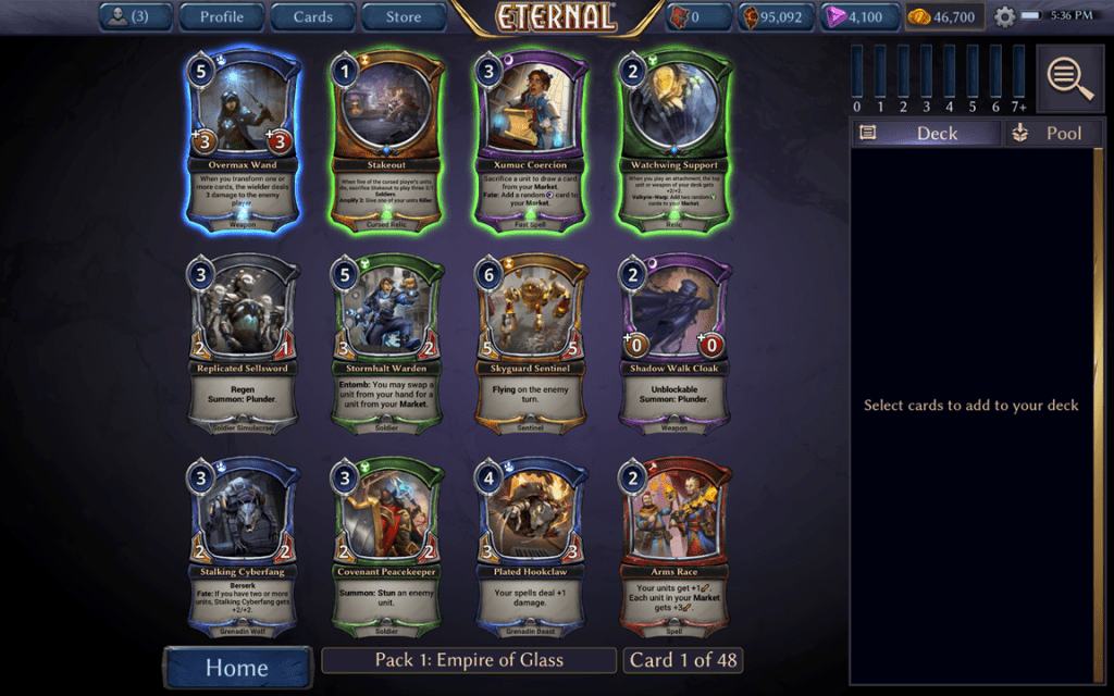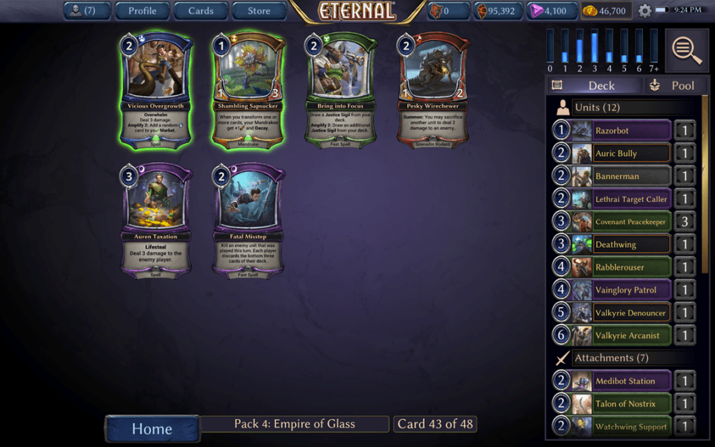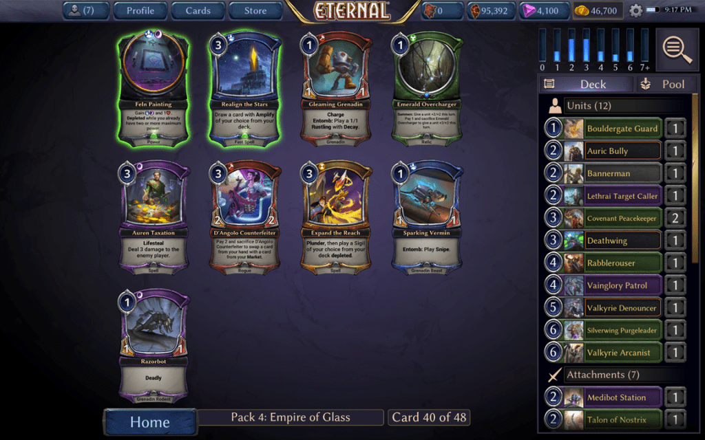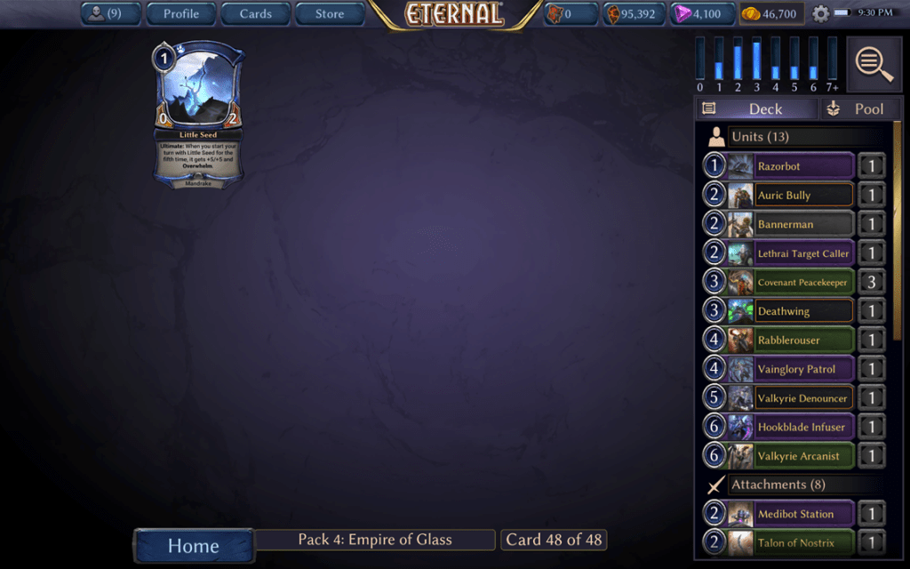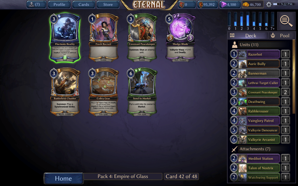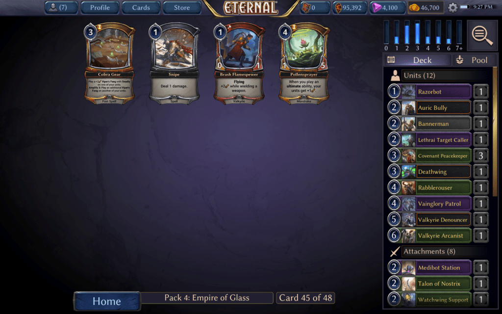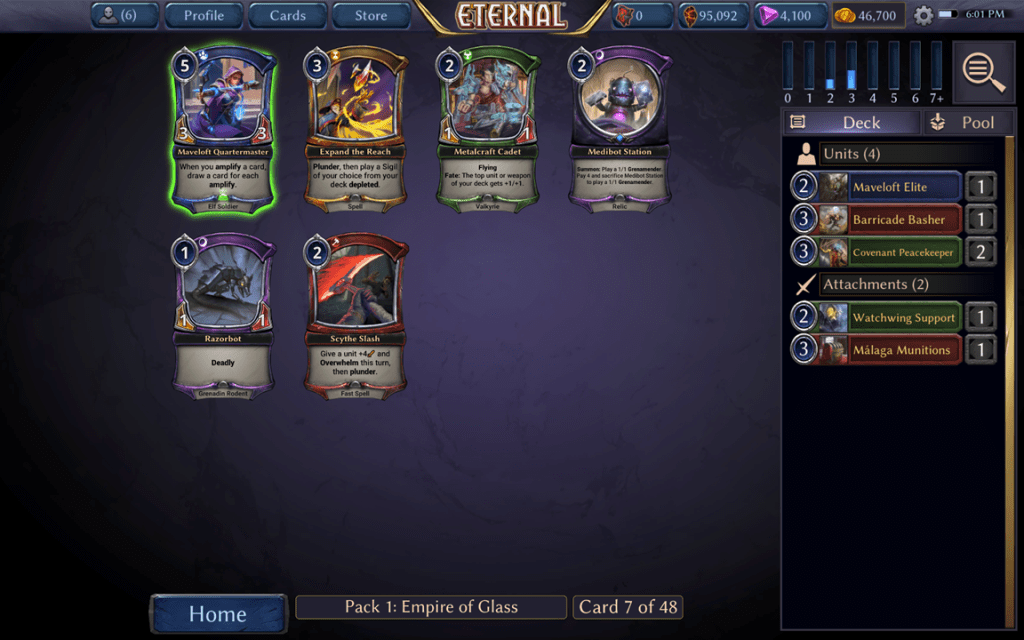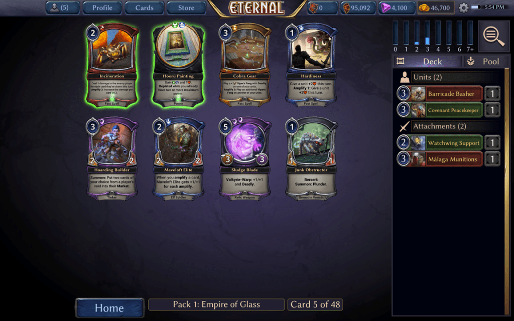 Coming out of this Pack 1, I’m honestly about where I’d usually be: I’ve got a general mish-mash of good cards, and am not entirely sure what faction pair or archetype I’m in right now. Not going to lie, really could have used a Gravity Glove. Or 2. That card is delightful glue holding everything together. Having said that, this just leaves me open to an assortment of options come the next few packs, so I’m excited to see what I can open.